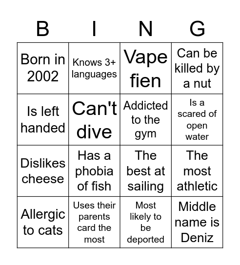 This bingo card has 16 words: Uses their parents card the most, The most athletic, Vape fien, Born in 2002, Dislikes cheese, Knows 3+ languages, The best at sailing, Most likely to be deported, Is left handed, Can't dive, Allergic to cats, Can be killed by a nut, Has a phobia of fish, Is a scared of open water, Addicted to the gym and Middle name is Deniz.