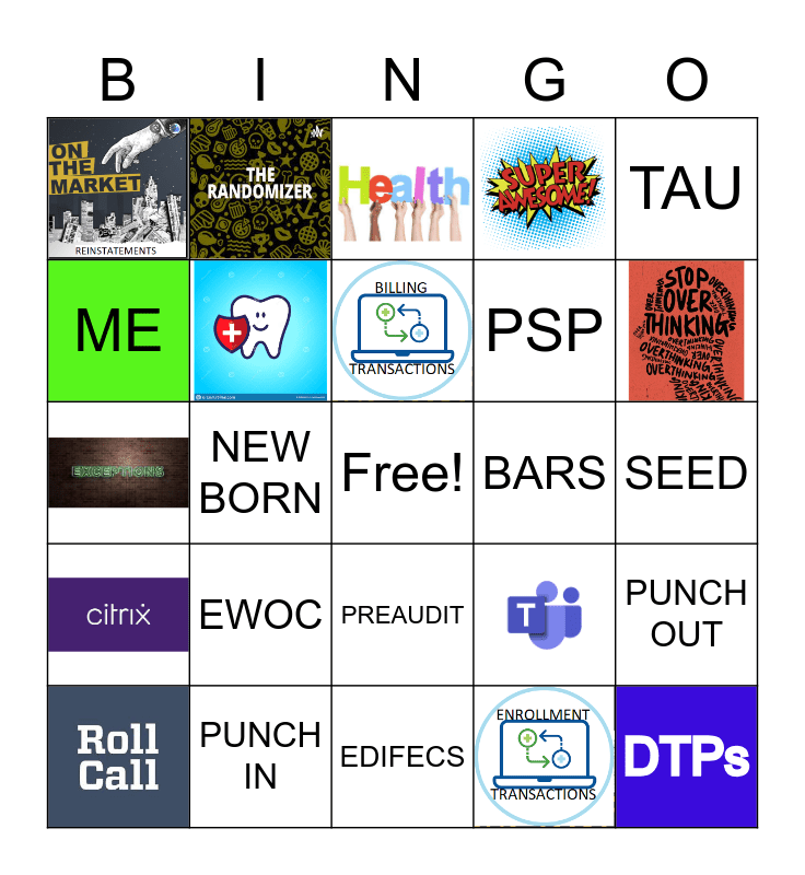 This bingo card has 12 images, a free space and 12 words: EWOC, PUNCH IN, TAU, ME, BARS, PREAUDIT, PSP, PUNCH OUT, SEED, NEW BORN, DTPs and EDIFECS.