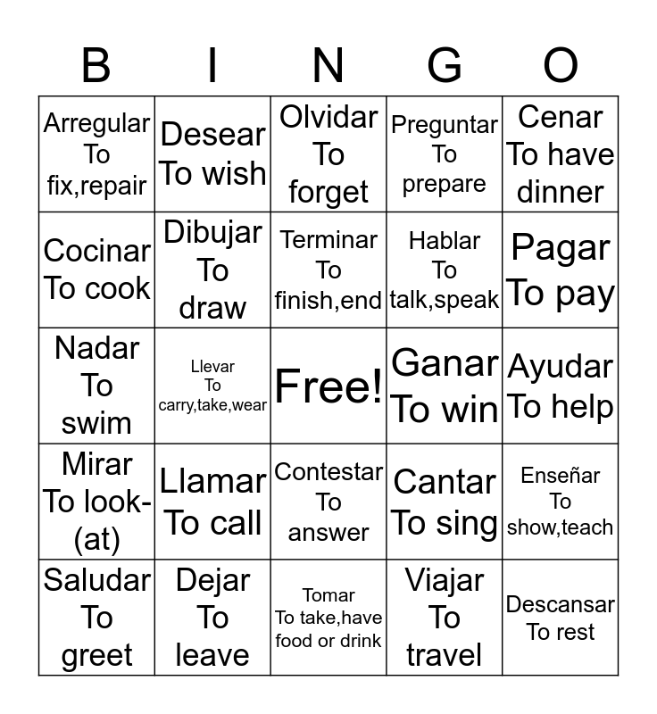 This bingo card has a free space and 24 words: Llamar To call, Dejar To leave, Terminar To finish,end, Saludar To greet, Cenar To have dinner, Arregular To fix,repair, Cocinar To cook, Desear To wish, Ganar To win, Contestar To answer, Hablar To talk,speak, Nadar To swim, Cantar To sing, Enseñar To show,teach, Dibujar To draw, Viajar To travel, Ayudar To help, Olvidar To forget, Pagar To pay, Llevar To carry,take,wear, Descansar To rest, Mirar To look-(at), Preguntar To prepare and Tomar To take,have food or drink.
