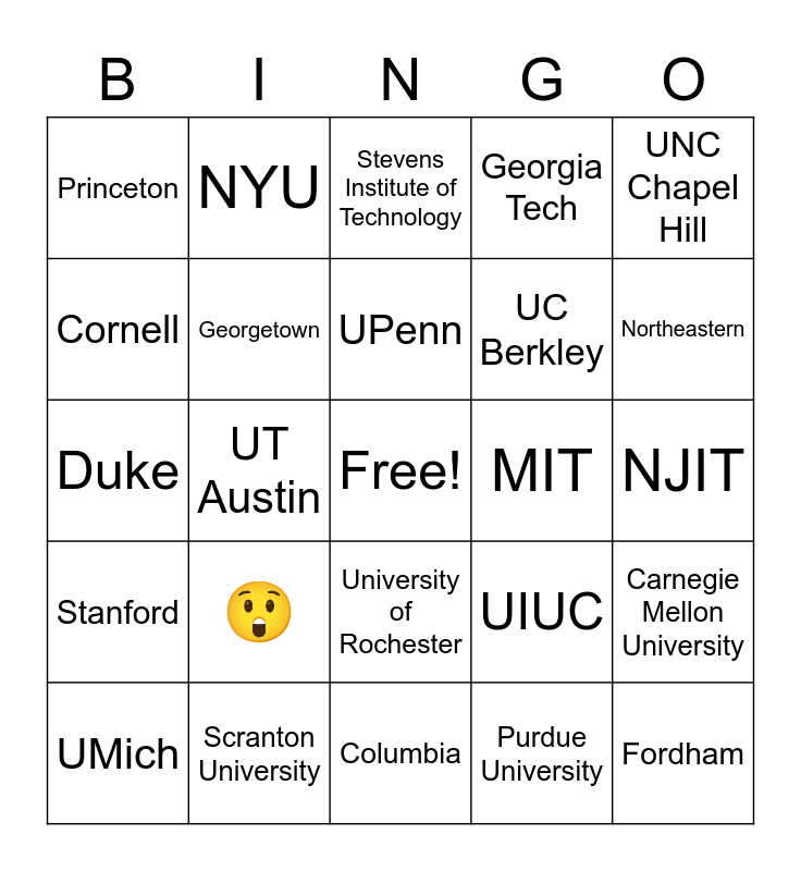 This bingo card has a free space and 25 words: 😲, Columbia, UPenn, UMich, UNC Chapel Hill, Princeton, Cornell, NYU, MIT, University of Rochester, UC Berkley, Duke, UIUC, Carnegie Mellon University, Georgetown, Rutgers University, NJIT, Stevens Institute of Technology, Northeastern, UT Austin, Fordham, Scranton University, Stanford, Georgia Tech and Purdue University.