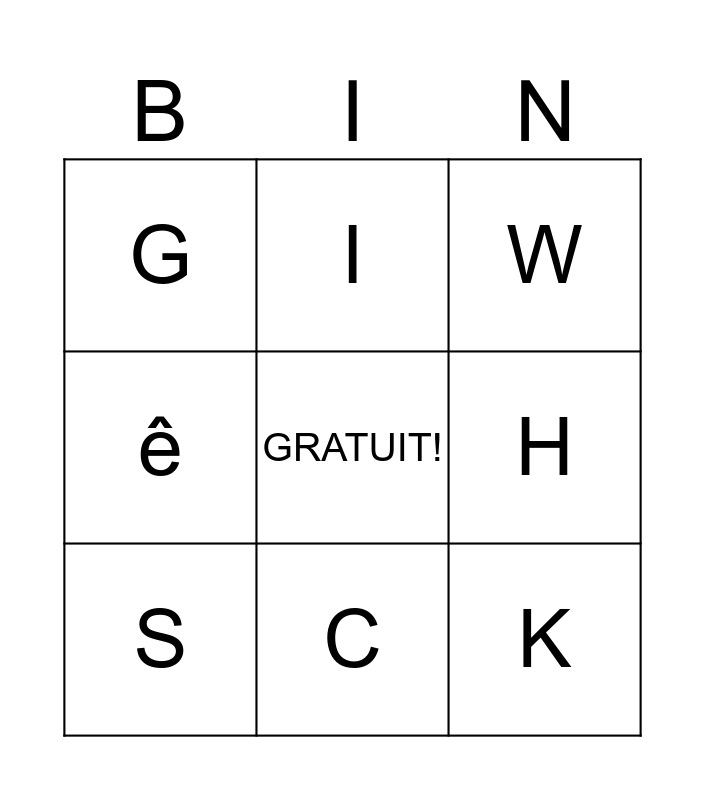 This bingo card has 25 words: A, B, C, E, GRATUIT!, G, H, I, J, D, K, O, Q, R, S, U, V, W, X, Y, Z, é, è, ê and ç.