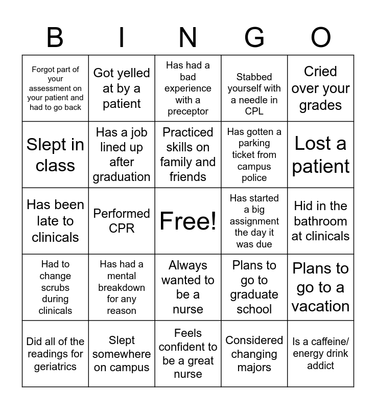 This bingo card has a free space and 24 words: Has had a mental breakdown for any reason, Slept somewhere on campus, Practiced skills on family and friends, Did all of the readings for geriatrics, Cried over your grades, Forgot part of your assessment on your patient and had to go back, Slept in class, Got yelled at by a patient, Has started a big assignment the day it was due, Always wanted to be a nurse, Has gotten a parking ticket from campus police, Has been late to clinicals, Plans to go to graduate school, Plans to go to a vacation, Has a job lined up after graduation, Considered changing majors, Hid in the bathroom at clinicals, Has had a bad experience with a preceptor, Lost a patient, Performed CPR, Is a caffeine/ energy drink addict, Had to change scrubs during clinicals, Stabbed yourself with a needle in CPL and Feels confident to be a great nurse.