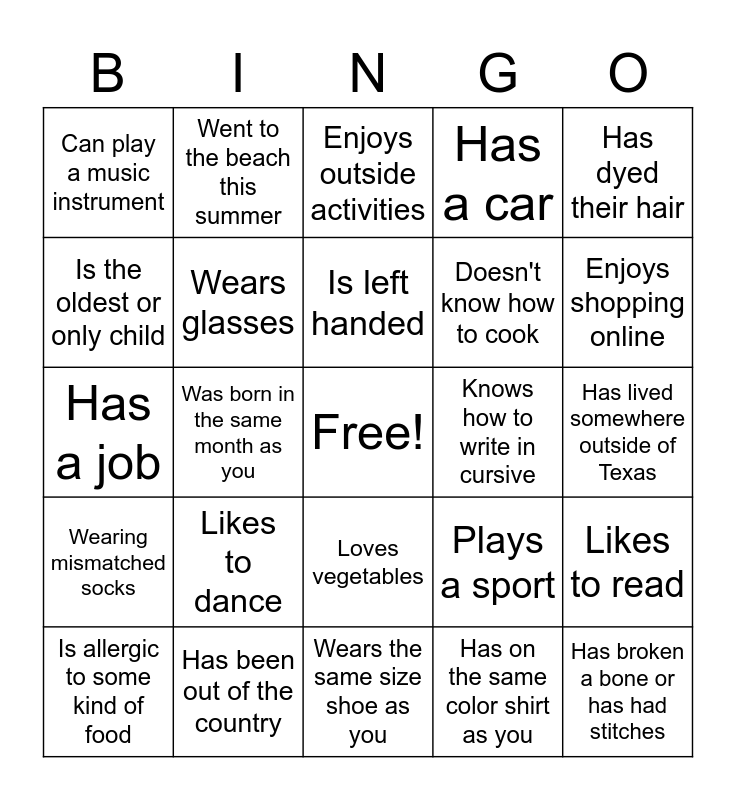 This bingo card has a free space and 25 words: Wearing mismatched socks, Has been out of the country, Wears the same size shoe as you, Has on the same color shirt as you, Has dyed their hair, Can play a music instrument, Went to the beach this summer, Enjoys outside activities, Knows how to write in cursive, Likes to read, Is the oldest or only child, Wears glasses, Has 2 or more pets, Plays a sport, Enjoys shopping online, Is allergic to some kind of food, Was born in the same month as you, Is left handed, Doesn't know how to cook, Has lived somewhere outside of Texas, Has a job, Likes to dance, Loves vegetables, Has a car and Has broken a bone or has had stitches.