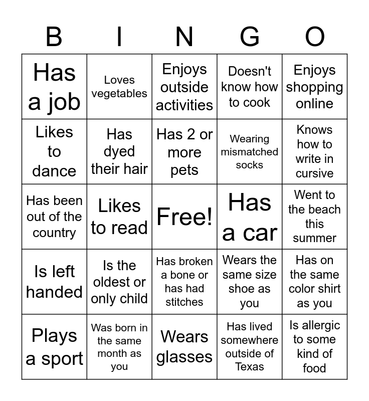This bingo card has a free space and 25 words: Is the oldest or only child, Wears glasses, Has 2 or more pets, Plays a sport, Enjoys shopping online, Has a job, Likes to dance, Loves vegetables, Has a car, Has broken a bone or has had stitches, Wearing mismatched socks, Has been out of the country, Wears the same size shoe as you, Has on the same color shirt as you, Has dyed their hair, Can play a music instrument, Went to the beach this summer, Enjoys outside activities, Knows how to write in cursive, Likes to read, Is allergic to some kind of food, Was born in the same month as you, Is left handed, Doesn't know how to cook and Has lived somewhere outside of Texas.