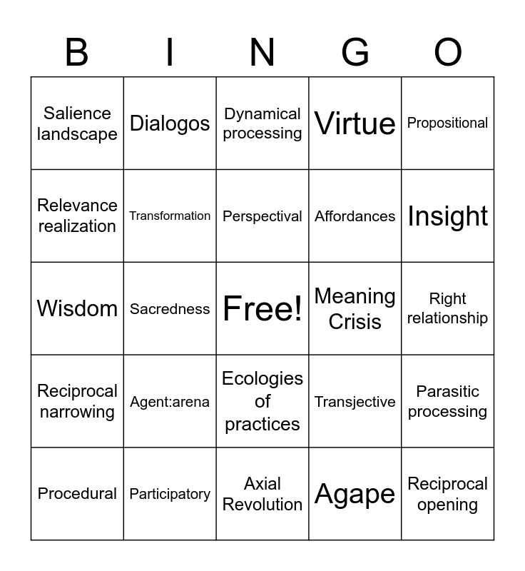 This bingo card has a free space and 24 words: Agent:arena, Participatory, Perspectival, Procedural, Propositional, Salience landscape, Relevance realization, Dialogos, Meaning Crisis, Ecologies of practices, Affordances, Wisdom, Transjective, Parasitic processing, Transformation, Agape, Right relationship, Dynamical processing, Insight, Sacredness, Reciprocal opening, Reciprocal narrowing, Virtue and Axial Revolution.