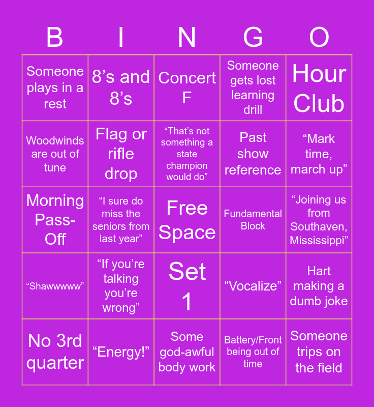 This bingo card has a free space and 24 words: “If you’re talking you’re wrong”, “Energy!”, “That’s not something a state champion would do”, No 3rd quarter, Hour Club, Someone plays in a rest, Woodwinds are out of tune, 8’s and 8’s, Fundamental Block, Set 1, Past show reference, Morning Pass-Off, “Vocalize”, Hart making a dumb joke, Flag or rifle drop, Battery/Front being out of time, “Joining us from Southaven, Mississippi”, Concert F, “Mark time, march up”, “I sure do miss the seniors from last year”, Someone trips on the field, “Shawwwww”, Someone gets lost learning drill and Some god-awful body work.