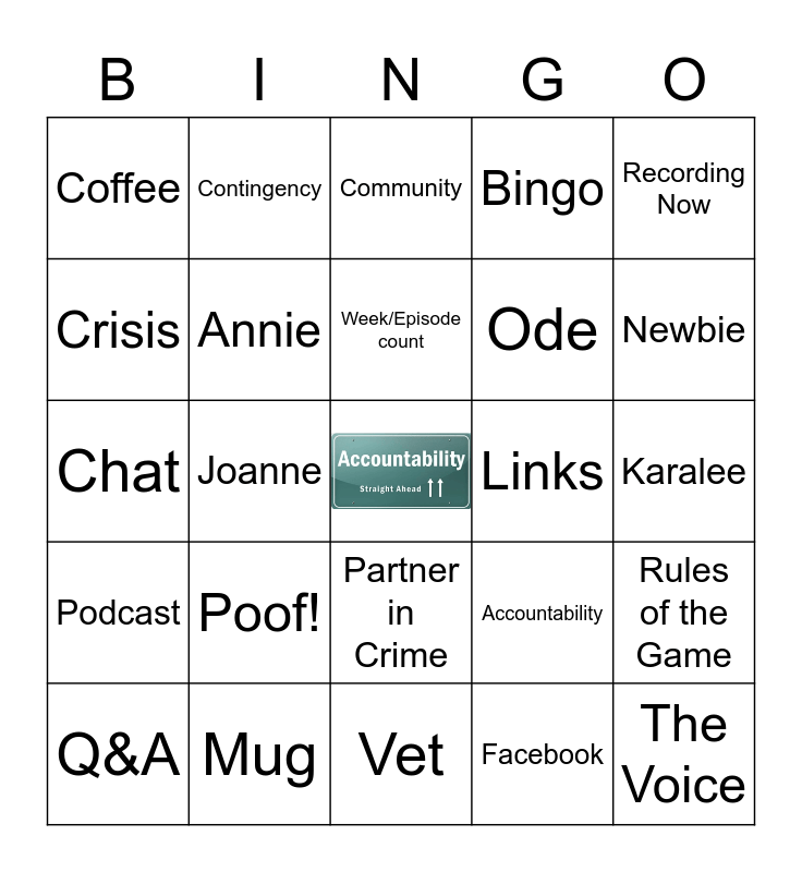 This bingo card has a free space and 27 words: Accountability, Power, Ode, Vet, Crisis, Community, Contingency, Podcast, Links, Rules of the Game, Chat, Bingo, Q&A, Mug, Newbie, NCHE, Annie, Week/Episode count, Poof!, Coffee, Karalee, Facebook, Joanne, The Voice, Partner in Crime, Recording Now and After Party.