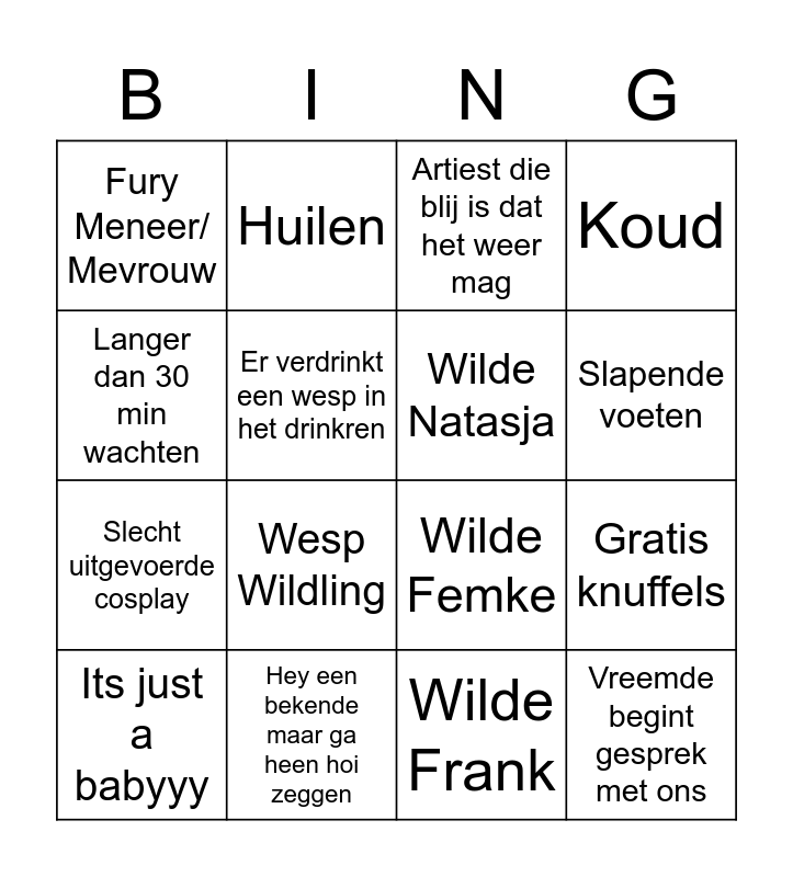 This bingo card has 18 words: Wesp Wildling, Vreemde begint gesprek met ons, Artiest die blij is dat het weer mag, Fury Meneer/ Mevrouw, Wilde Femke, Koud, Its just a babyyy, Huilen, Slapende voeten, Slecht uitgevoerde cosplay, Wilde Frank, Langer dan 30 min wachten, Gratis knuffels, Er verdrinkt een wesp in het drinkren, Wilde Natasja, Stranger things, Hey een bekende maar ga heen hoi zeggen and Wilde Mark.