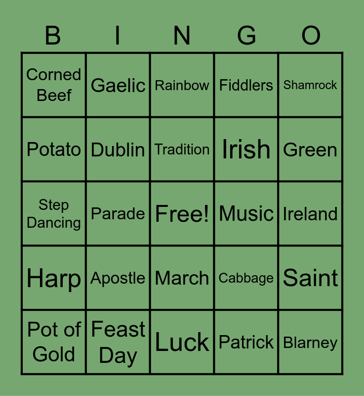 This bingo card has a free space and 24 words: Apostle, Feast Day, Tradition, Pot of Gold, Shamrock, Corned Beef, Potato, Gaelic, Music, March, Irish, Step Dancing, Cabbage, Saint, Dublin, Patrick, Ireland, Rainbow, Green, Parade, Blarney, Harp, Fiddlers and Luck.