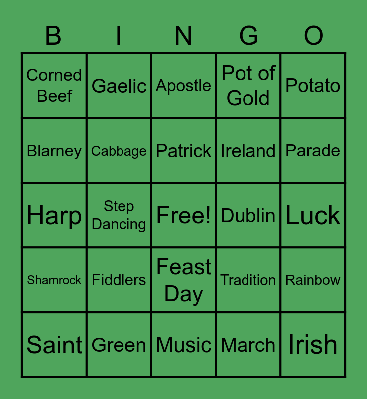 This bingo card has a free space and 24 words: Fiddlers, Green, Patrick, Saint, Potato, Corned Beef, Blarney, Gaelic, Dublin, Feast Day, Ireland, Harp, Tradition, Rainbow, Cabbage, March, Luck, Apostle, Parade, Step Dancing, Irish, Shamrock, Pot of Gold and Music.