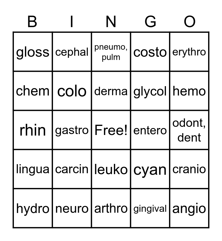 This bingo card has a free space and 48 words: aden, angio, arterio, arthro, carcin, cardio, cephal, cerebro, chem, chole, colo, costo, cranio, cyan, cysto, cyte, derma, entero, epidemi, erythro, gastro, gingival, gloss, glycol, hepat, hemo, hydro, hystero, leuko, lingua, mamm, mast, myelo, myo, nephro, ren, neuro, ocul, ophthal, oophor, odont, dent, osteo, oto, ped, pod, phleb, pneumo, pulm, psych, rhin, salpingo, throac and trach.