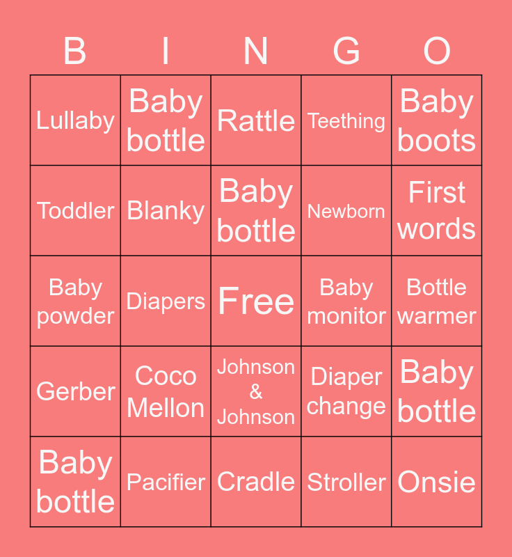 This bingo card has a free space and 29 words: Baby bottle, Bib, Diapers, Formula, Lullaby, Rattle, Blanky, Coco Mellon, Baby monitor, Pacifier, Bottle warmer, Onsie, Cradle, Stroller, First words, Bonnet, Johnson & Johnson, Gerber, Baby boots, Baby powder, Diaper change, Breast feeding, Newborn, Toddler, Teething, Baby bottle, Baby bottle, Baby bottle and Baby bottle.