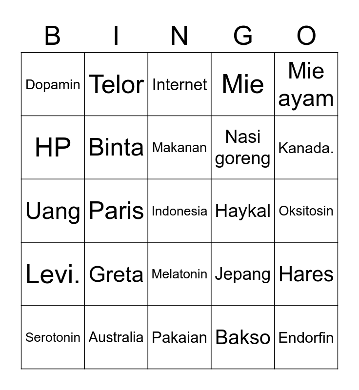 This bingo card has a free space and 24 words: Greta, Australia, Makanan, Serotonin, Mie ayam, Dopamin, HP, Telor, Haykal, Melatonin, Nasi goreng, Uang, Jepang, Hares, Binta, Bakso, Oksitosin, Internet, Kanada., Paris, Endorfin, Levi., Mie and Pakaian.