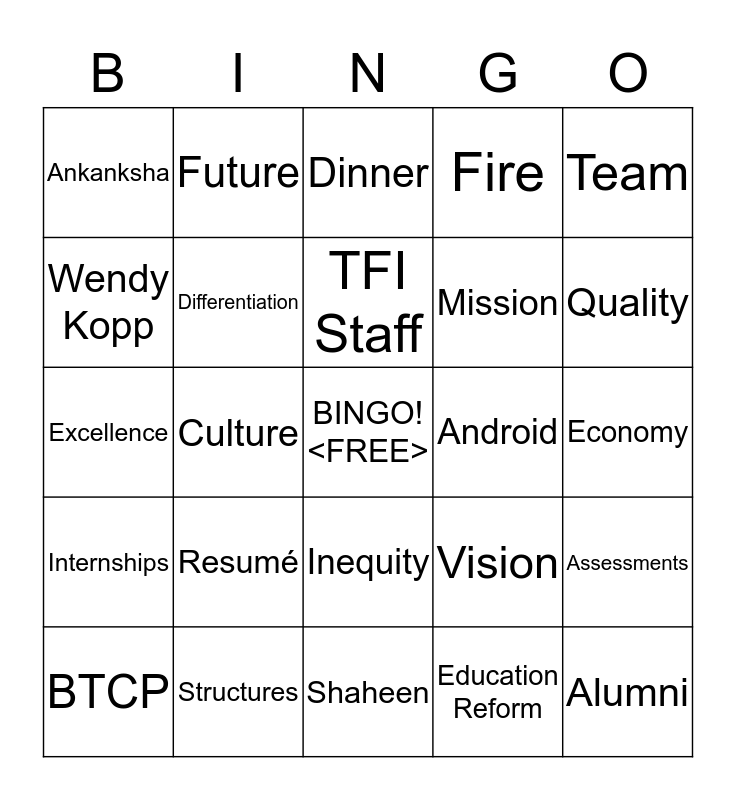This bingo card has a free space and 24 words: Resumé, Structures, TFI Staff, BTCP, Team, Ankanksha, Wendy Kopp, Future, Android, Inequity, Mission, Excellence, Vision, Assessments, Differentiation, Education Reform, Economy, Dinner, Quality, Culture, Alumni, Internships, Fire and Shaheen.