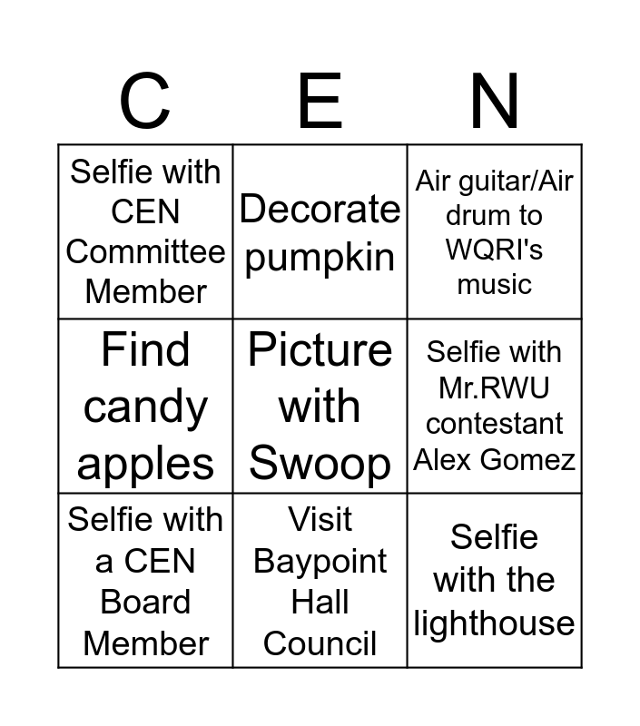 This bingo card has a free space and 8 words: Selfie with Mr.RWU contestant Alex Gomez, Air guitar/Air drum to WQRI's music, Decorate pumpkin, Selfie with a CEN Board Member, Selfie with CEN Committee Member, Selfie with the lighthouse, Find candy apples and Visit Baypoint Hall Council.