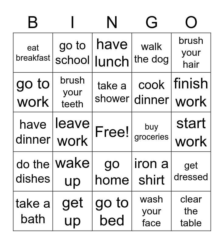 This bingo card has a free space and 24 words: wake up, get up, take a shower, take a bath, brush your hair, eat breakfast, go to work, go to school, buy groceries, go home, cook dinner, have dinner, iron a shirt, get dressed, brush your teeth, wash your face, start work, have lunch, finish work, leave work, clear the table, do the dishes, walk the dog and go to bed.