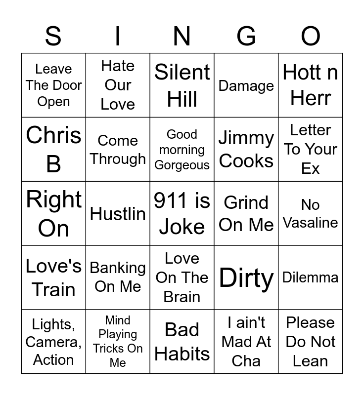 This bingo card has 49 words: 24 Karat Magic, 911 is Joke, All Of Me, Bad Habits, Banking On Me, Before I let Go, Hate Our Love, Bodak Yellow, Chris B, Clout, Come Through, Damage, Dilemma, Dirty, Pick up Your Feelings, For Fun, Good morning Gorgeous, Grind On Me, Hotel Lobby, Hott n Herr, Hustlin, I ain't Mad At Cha, Leave The Door Open, Jimmy Cooks, Legs, Hips, Body, Letter To Your Ex, Lights, Camera, Action, Love And War, Love On The Brain, Love's Train, Magic Stick, Just Fine, Rent Money, Money Dance, Mind Playing Tricks On Me, N95, Nasty, Neyo, No Vasaline, Paid In Full, Pimp Juice, Plan B, Please Do Not Lean, Racks In The Middle, Right On, Silent Hill, Thick Of It, Wait For You and Wild Thoughts.