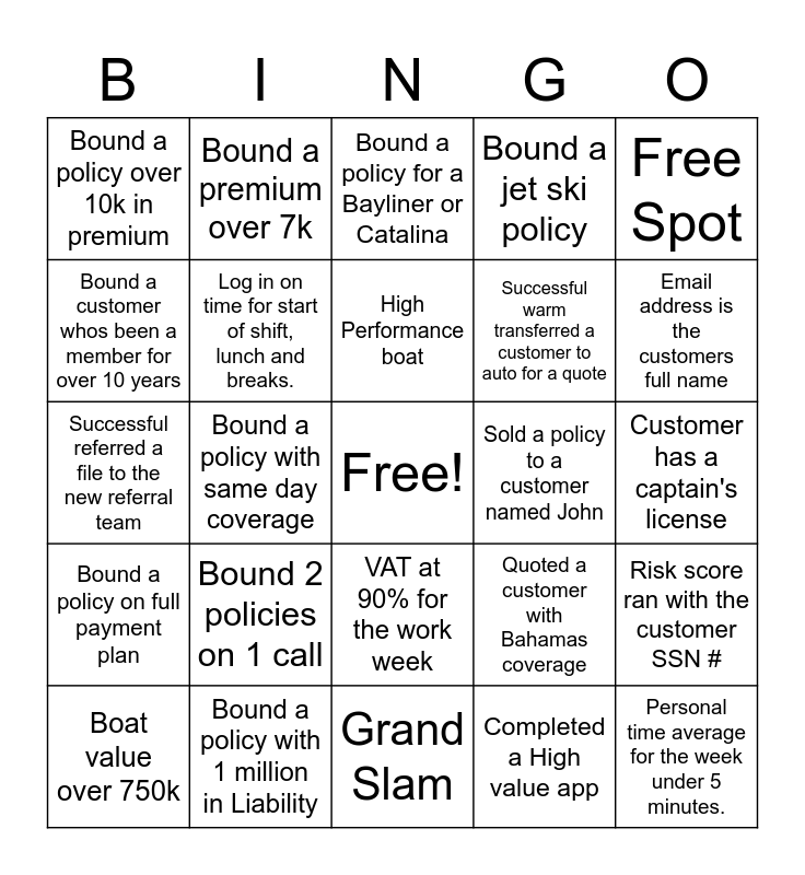 This bingo card has a free space and 25 words: Bound 2 policies on 1 call, Grand Slam, High Performance boat, Boat value over 750k, Free Spot, Bound a policy over 10k in premium, Bound a customer whos been a member for over 10 years, Bound a premium over 7k, Sold a policy to a customer named John, VAT at 90% for the work week, Successful warm transferred a customer to auto for a quote, Successful referred a file to the new referral team, Quoted a customer with Bahamas coverage, Risk score ran with the customer SSN #, Log in on time for start of shift, lunch and breaks., Closure over 60% for the week., Customer has a captain's license, Bound a policy for a Bayliner or Catalina, Email address is the customers full name, Bound a policy with same day coverage, Personal time average for the week under 5 minutes., Bound a policy with 1 million in Liability, Bound a policy on full payment plan, Bound a jet ski policy and Completed a High value app.