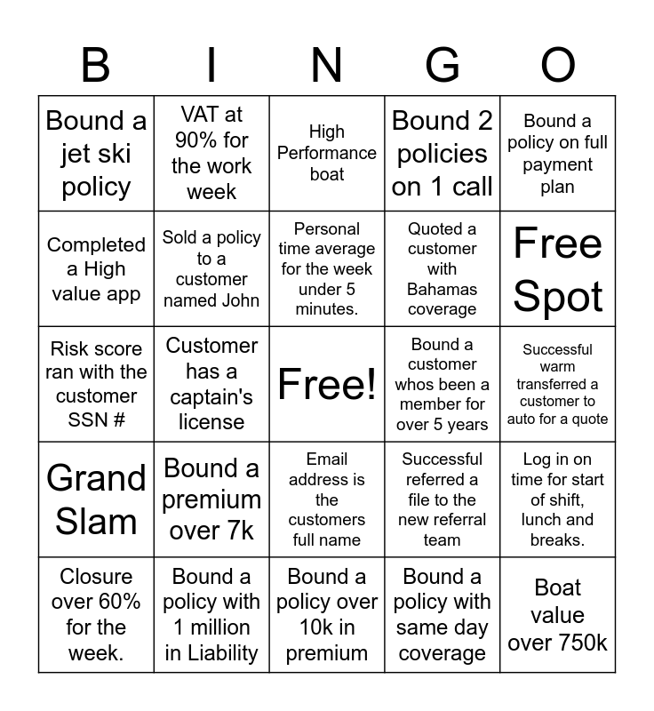 This bingo card has a free space and 26 words: Email address is the customers full name, Bound a policy with same day coverage, Personal time average for the week under 5 minutes., Bound a policy with 1 million in Liability, Bound a policy on full payment plan, Bound a jet ski policy, Completed a High value app, VAT at 90% for the work week, Successful warm transferred a customer to auto for a quote, Successful referred a file to the new referral team, Quoted a customer with Bahamas coverage, Risk score ran with the customer SSN #, Log in on time for start of shift, lunch and breaks., Closure over 60% for the week., Customer has a captain's license, Bound a policy for a Bayliner or Catalina, Bound 2 policies on 1 call, Grand Slam, High Performance boat, Boat value over 750k, Free Spot, Bound a policy over 10k in premium, Bound a customer whos been a member for over 5 years, Bound a premium over 7k, Sold a policy to a customer named John and Bound a policy for a Bayliner or Catalina.