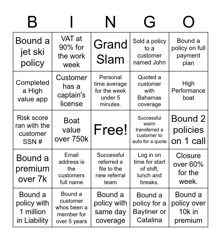 This bingo card has a free space and 25 words: Email address is the customers full name, Bound a policy with same day coverage, Personal time average for the week under 5 minutes., Bound a policy with 1 million in Liability, Bound a policy on full payment plan, Bound a jet ski policy, Completed a High value app, VAT at 90% for the work week, Successful warm transferred a customer to auto for a quote, Successful referred a file to the new referral team, Quoted a customer with Bahamas coverage, Risk score ran with the customer SSN #, Log in on time for start of shift, lunch and breaks., Closure over 60% for the week., Customer has a captain's license, Bound a policy for a Bayliner or Catalina, Bound 2 policies on 1 call, Grand Slam, High Performance boat, Boat value over 750k, Bound a policy over 10k in premium, Bound a customer whos been a member for over 5 years, Bound a premium over 7k, Sold a policy to a customer named John and Bound a policy for a Bayliner or Catalina.
