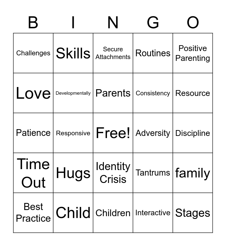 This bingo card has a free space and 28 words: family, Nurturing, Consistency, Interactive, Love, Secure Attachments, Skills, Time Out, Adversity, Best Practice, Patience, Routines, Child, Children, Resource, Crawling, Hugs, Developmentally, Parents, Identity Crisis, Challenges, Appropriate, Stages, Responsive, Discipline, Tantrums, Positive Parenting and Behaviors.