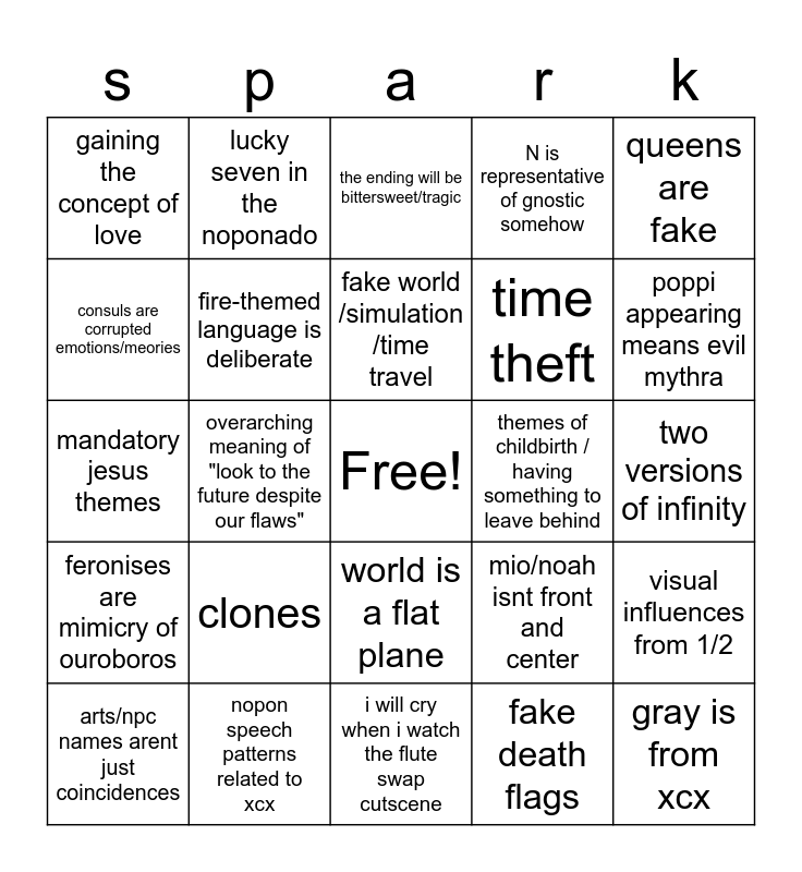 This bingo card has a free space and 24 words: clones, nopon speech patterns related to xcx, fake world /simulation /time travel, arts/npc names arent just coincidences, queens are fake, gaining the concept of love, consuls are corrupted emotions/meories, lucky seven in the noponado, themes of childbirth / having something to leave behind, world is a flat plane, time theft, mandatory jesus themes, mio/noah isnt front and center, visual influences from 1/2, fire-themed language is deliberate, fake death flags, two versions of infinity, the ending will be bittersweet/tragic, poppi appearing means evil mythra, overarching meaning of "look to the future despite our flaws", gray is from xcx, feronises are mimicry of ouroboros, N is representative of gnostic somehow and i will cry when i watch the flute swap cutscene.