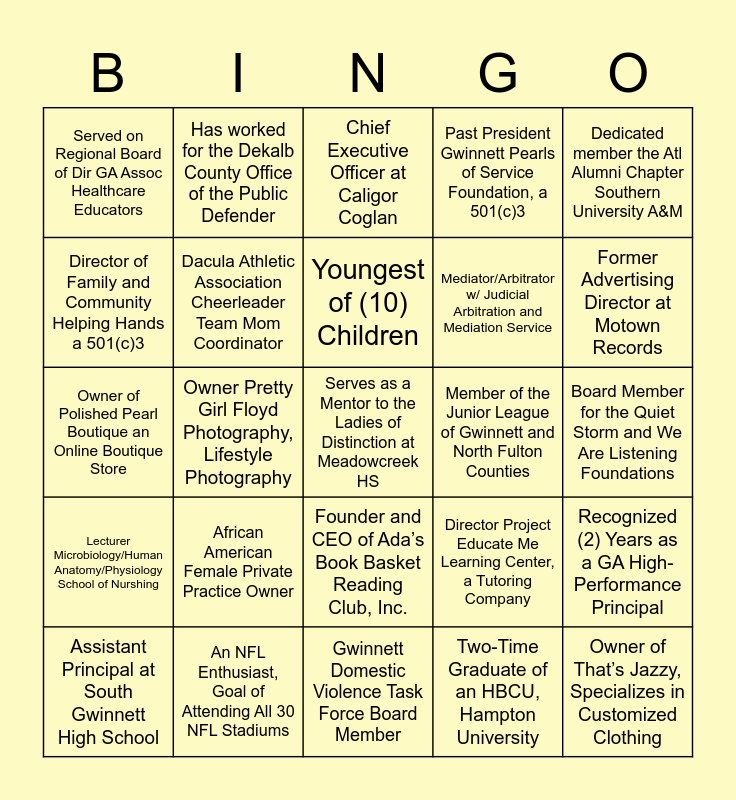This bingo card has 25 words: African American Female Private Practice Owner, Gwinnett Domestic Violence Task Force Board Member, Youngest of (10) Children, Assistant Principal at South Gwinnett High School, Dedicated member the Atl Alumni Chapter Southern University A&M, Served on Regional Board of Dir GA Assoc Healthcare Educators, Director of Family and Community Helping Hands a 501(c)3, Has worked for the Dekalb County Office of the Public Defender, Member of the Junior League of Gwinnett and North Fulton Counties, Founder and CEO of Ada’s Book Basket Reading Club, Inc., Mediator/Arbitrator w/ Judicial Arbitration and Mediation Service, Owner of Polished Pearl Boutique an Online Boutique Store, Director Project Educate Me Learning Center, a Tutoring Company, Recognized (2) Years as a GA High-Performance Principal, Dacula Athletic Association Cheerleader Team Mom Coordinator, Owner of That’s Jazzy, Specializes in Customized Clothing, Board Member for the Quiet Storm and We Are Listening Foundations, Chief Executive Officer at Caligor Coglan, Former Advertising Director at Motown Records, Owner Pretty Girl Floyd Photography, Lifestyle Photography, Serves as a Mentor to the Ladies of Distinction at Meadowcreek HS, An NFL Enthusiast, Goal of Attending All 30 NFL Stadiums, Lecturer Microbiology/Human Anatomy/Physiology School of Nurshing, Past President Gwinnett Pearls of Service Foundation, a 501(c)3 and Two-Time Graduate of an HBCU, Hampton University.