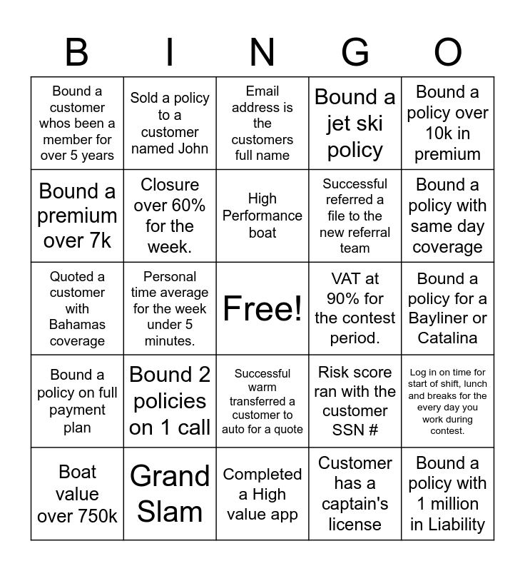 This bingo card has a free space and 24 words: Bound 2 policies on 1 call, Grand Slam, High Performance boat, Boat value over 750k, Bound a policy over 10k in premium, Bound a customer whos been a member for over 5 years, Bound a premium over 7k, Sold a policy to a customer named John, VAT at 90% for the contest period., Successful warm transferred a customer to auto for a quote, Successful referred a file to the new referral team, Quoted a customer with Bahamas coverage, Risk score ran with the customer SSN #, Log in on time for start of shift, lunch and breaks for the every day you work during contest., Closure over 60% for the week., Customer has a captain's license, Bound a policy for a Bayliner or Catalina, Email address is the customers full name, Bound a policy with same day coverage, Personal time average for the week under 5 minutes., Bound a policy with 1 million in Liability, Bound a policy on full payment plan, Bound a jet ski policy and Completed a High value app.