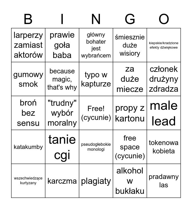 This bingo card has a free space and 25 words: tanie cgi, plagiaty, typo w kapturze, wszechwiedzące kurtyzany, kiepskie/kradzione efekty dźwiękowe, larperzy zamiast aktorów, gumowy smok, prawie goła baba, propy z kartonu, pseudogłebokie monologi, za duże miecze, broń bez sensu, free space (cycunie), tokenowa kobieta, because magic, that's why, tragiczne backstory głównego bohatera, male lead, główny bohater jest wybrańcem, członek drużyny zdradza, "trudny" wybór moralny, pradawny las, karczma, katakumby, śmiesznie duże wisiory and alkohol w bukłaku.