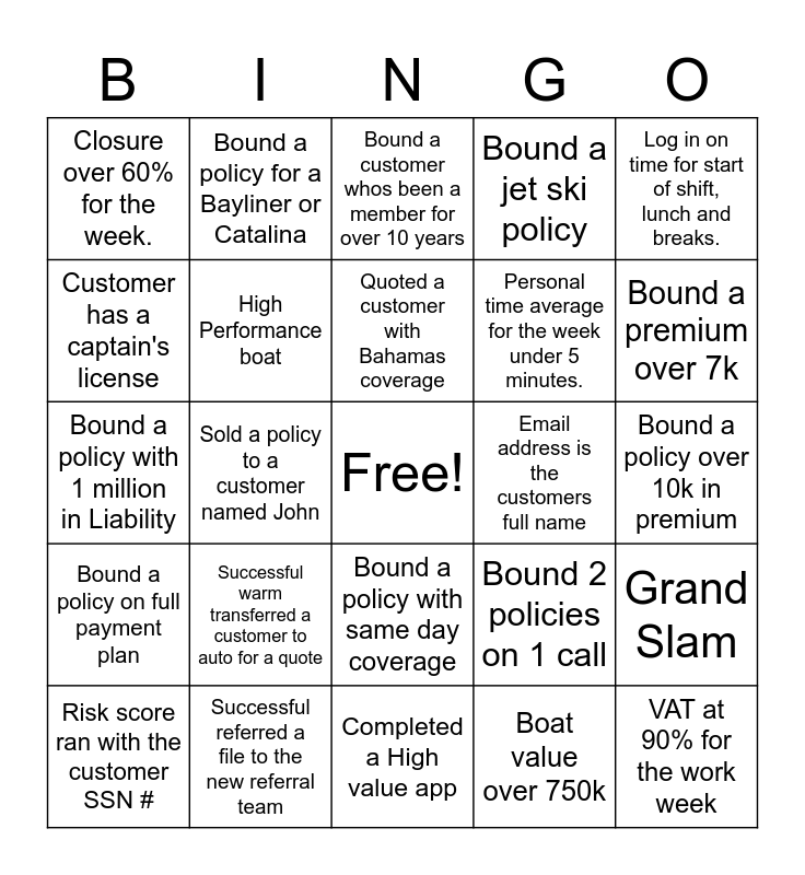This bingo card has a free space and 24 words: Successful warm transferred a customer to auto for a quote, Successful referred a file to the new referral team, Quoted a customer with Bahamas coverage, Risk score ran with the customer SSN #, Log in on time for start of shift, lunch and breaks., Closure over 60% for the week., Customer has a captain's license, Bound a policy for a Bayliner or Catalina, Email address is the customers full name, Bound a policy with same day coverage, Personal time average for the week under 5 minutes., Bound a policy with 1 million in Liability, Bound 2 policies on 1 call, Grand Slam, High Performance boat, Boat value over 750k, Bound a policy over 10k in premium, Bound a customer whos been a member for over 10 years, Bound a premium over 7k, Sold a policy to a customer named John, VAT at 90% for the work week, Bound a policy on full payment plan, Bound a jet ski policy and Completed a High value app.