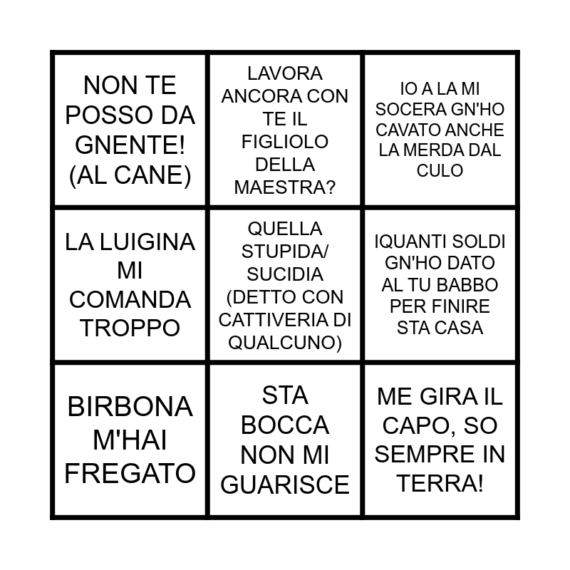 This bingo card has 9 words: BIRBONA M'HAI FREGATO, IO A LA MI SOCERA GN'HO CAVATO ANCHE LA MERDA DAL CULO, LAVORA ANCORA CON TE IL FIGLIOLO DELLA MAESTRA?, LA LUIGINA MI COMANDA TROPPO, NON TE POSSO DA GNENTE! (AL CANE), IQUANTI SOLDI GN'HO DATO AL TU BABBO PER FINIRE STA CASA, QUELLA STUPIDA/ SUCIDIA (DETTO CON CATTIVERIA DI QUALCUNO), ME GIRA IL CAPO, SO SEMPRE IN TERRA! and STA BOCCA NON MI GUARISCE.