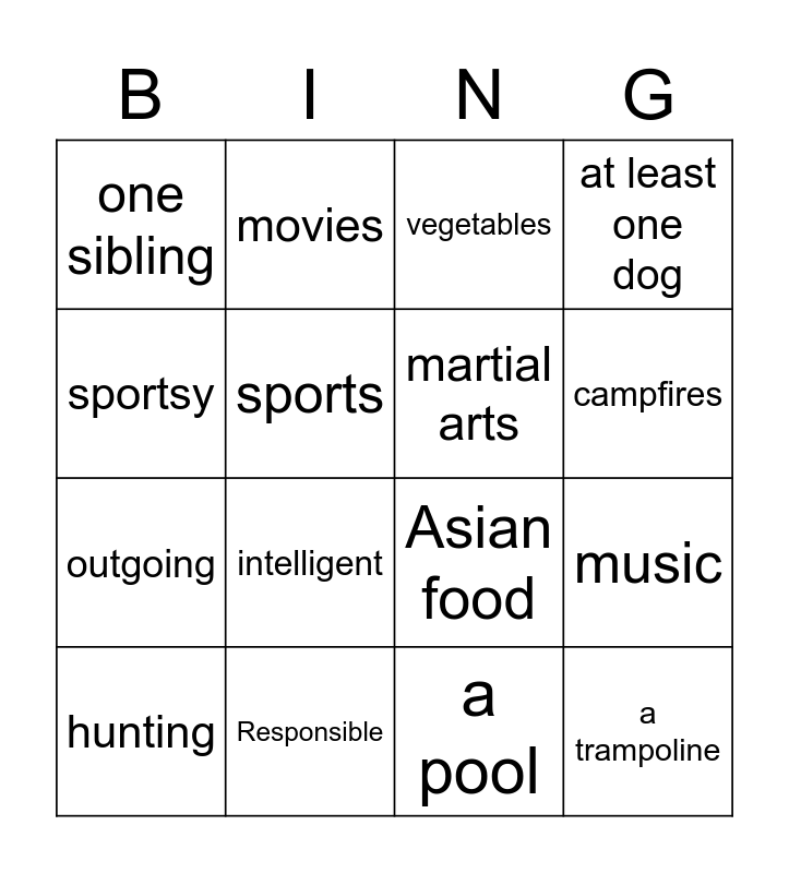 This bingo card has 16 words: Responsible, music, vegetables, one sibling, outgoing, movies, Asian food, a pool, sportsy, sports, hunting, at least one dog, intelligent, campfires, martial arts and a trampoline.