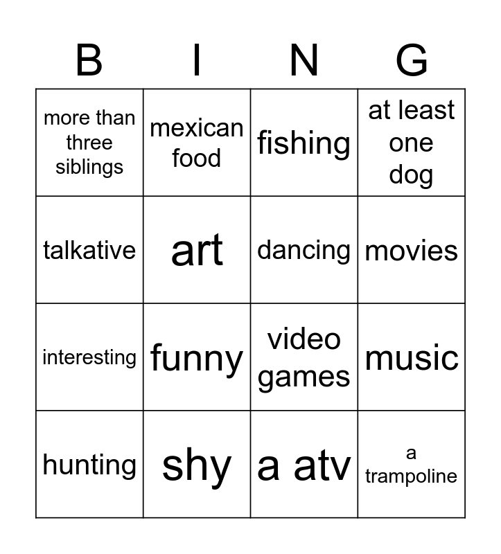 This bingo card has 16 words: shy, music, fishing, more than three siblings, interesting, mexican food, video games, a atv, talkative, art, hunting, at least one dog, funny, movies, dancing and a trampoline.