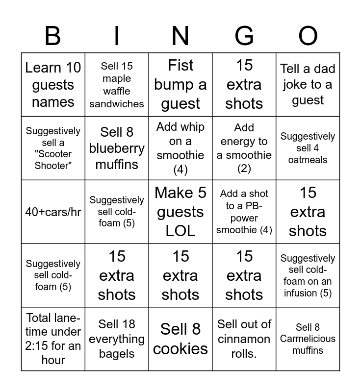 This bingo card has 25 words: 15 extra shots, Sell 8 cookies, Add whip on a smoothie (4), Total lane-time under 2:15 for an hour, Tell a dad joke to a guest, Learn 10 guests names, Suggestively sell a "Scooter Shooter", Sell 15 maple waffle sandwiches, Add a shot to a PB-power smoothie (4), 15 extra shots, Add energy to a smoothie (2), 40+cars/hr, 15 extra shots, Suggestively sell cold-foam on an infusion (5), Sell 8 blueberry muffins, Sell 8 Carmelicious muffins, 15 extra shots, Fist bump a guest, Suggestively sell 4 oatmeals, Suggestively sell cold-foam (5), Make 5 guests LOL, Sell 18 everything bagels, Suggestively sell cold-foam (5), 15 extra shots and Sell out of cinnamon rolls..