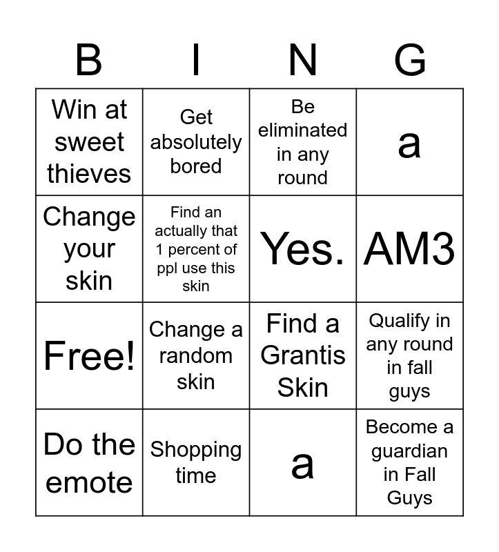 This bingo card has 20 words: Qualify in any round in fall guys, Become a winner in fall guys, Be eliminated in any round, Push a random player, Do the emote, Change your skin, Shopping time, Win at sweet thieves, Free!, Get absolutely bored, Change a random skin, Find a Grantis Skin, Find an actually that 1 percent of ppl use this skin, Become a guardian in Fall Guys, Yes., Yes., AM3, a, a and aa.