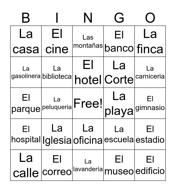 This bingo card has a free space and 24 words: La Iglesia, El correo, El hotel, La calle, La finca, La casa, La gasolinera, El cine, La playa, La oficina, La Corte, El parque, La escuela, El estadio, La biblioteca, El museo, El gimnasio, Las montañas, La carniceria, La peluqueria, El edificio, El hospital, El banco and La lavandería.