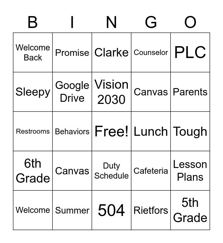This bingo card has a free space and 24 words: Canvas, Summer, Vision 2030, Welcome, PLC, Welcome Back, Sleepy, Promise, Lunch, Duty Schedule, Canvas, Restrooms, Cafeteria, Lesson Plans, Google Drive, Rietfors, Tough, Clarke, Parents, Behaviors, 5th Grade, 6th Grade, Counselor and 504.
