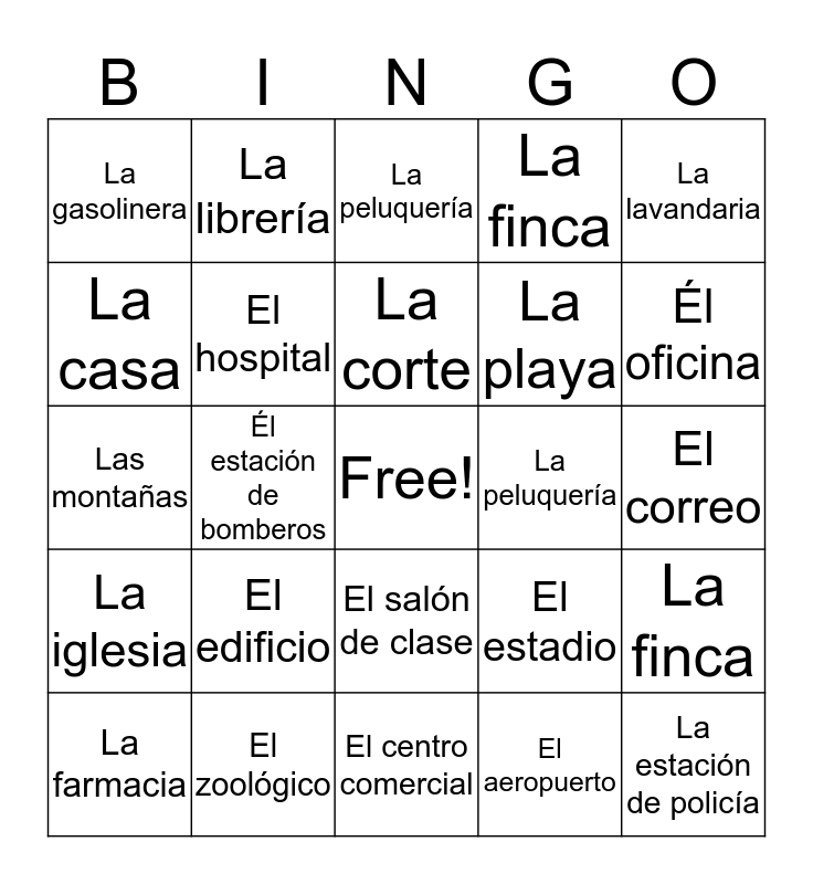 This bingo card has a free space and 24 words: El edificio, El zoológico, La corte, La farmacia, La lavandaria, La gasolinera, La casa, La librería, La peluquería, El salón de clase, La playa, Las montañas, El estadio, La finca, El hospital, El aeropuerto, El correo, La peluquería, Él oficina, Él estación de bomberos, La estación de policía, La iglesia, La finca and El centro comercial.
