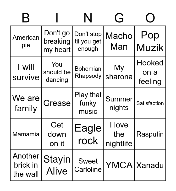 This bingo card has 59 words: Born to be alive, Stayin Alive, Dancing Queen, Mamamia, YMCA, Le Freak, You should be dancing, Nutbush city limits, My sharona, In the navy, Macho Man, Blame it on the boogie, I will survive, Do ya think I'm sexy, September, American pie, Play that funky music, Pop Muzik, You're the one that I want, Bohemian Rhapsody, Summer nights, Don't stop til you get enough, Another brick in the wall, Rasputin, Let it be, Brown Sugar, Superstition, Crocodile Rock, Hooked on a feeling, Stuck in the middle with you, Kung Fu Fighting, Lady Marmalade, That's the way I like it, Oh What a night, Don't go breaking my heart, You make me feel like dancing, Hotel California, Grease, Knock on wood, We are family, Escape (the pina colada song), Get down on it, Satisfaction, Video killed the radio star, Waterloo, Gimmie Gimmie Gimmie (A man after midnight), Love is in the air, Sweet home Alabama, Eagle rock, Sweet Carloline, T.N.T, Jump in my car, Howzat, You sexy thing, Night Fever, I love the nightlife, Rock with you, Xanadu and Celebration.