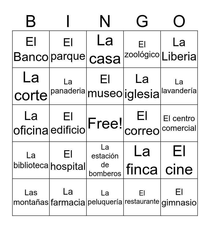 This bingo card has a free space and 24 words: El hospital, La farmacia, El museo, Las montañas, La Liberia, El Banco, La corte, El parque, El correo, La estación de bomberos, La iglesia, La oficina, La finca, El cine, La panaderia, El restaurante, El centro comercial, La casa, La lavandería, El edificio, El gimnasio, La biblioteca, El zoológico and La peluquería.