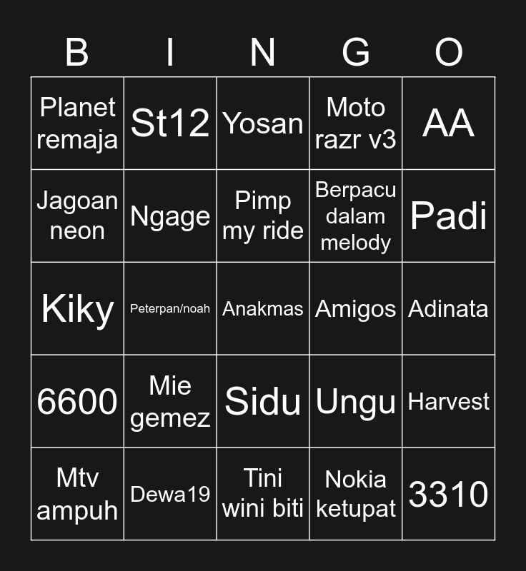 This bingo card has a free space and 24 words: Mie gemez, Dewa19, Pimp my ride, Mtv ampuh, AA, Planet remaja, Jagoan neon, St12, Amigos, Sidu, Berpacu dalam melody, Kiky, Ungu, Harvest, Ngage, Nokia ketupat, Adinata, Yosan, Padi, Peterpan/noah, 3310, 6600, Moto razr v3 and Tini wini biti.