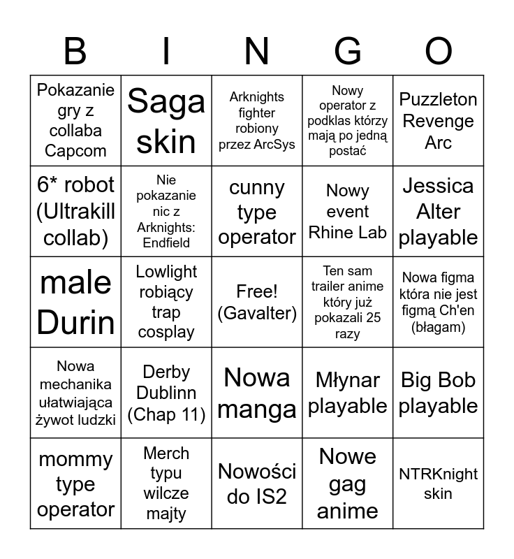 This bingo card has a free space and 24 words: Derby Dublinn (Chap 11), Merch typu wilcze majty, cunny type operator, mommy type operator, Puzzleton Revenge Arc, Pokazanie gry z collaba Capcom, 6* robot (Ultrakill collab), Saga skin, Ten sam trailer anime który już pokazali 25 razy, Nowa manga, Nowy event Rhine Lab, male Durin, Młynar playable, Big Bob playable, Nie pokazanie nic z Arknights: Endfield, Nowe gag anime, Nowa figma która nie jest figmą Ch'en (błagam), Arknights fighter robiony przez ArcSys, Jessica Alter playable, Lowlight robiący trap cosplay, NTRKnight skin, Nowa mechanika ułatwiająca żywot ludzki, Nowy operator z podklas którzy mają po jedną postać and Nowości do IS2.