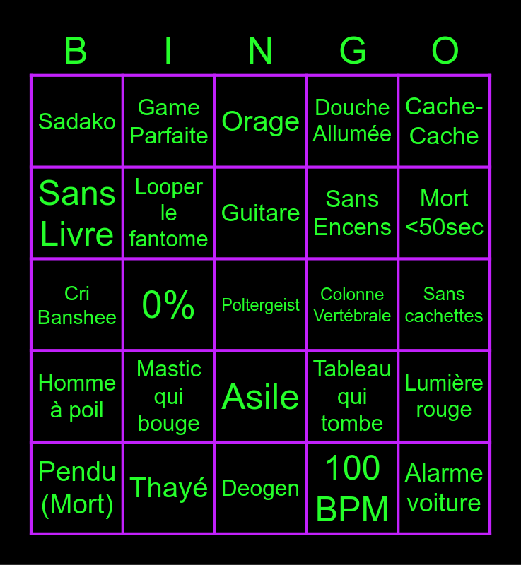 This bingo card has 25 words: Mastic qui bouge, Deogen, Guitare, Pendu (Mort), Cache-Cache, Sadako, Sans Livre, Game Parfaite, Colonne Vertébrale, Asile, Sans Encens, Cri Banshee, Tableau qui tombe, Lumière rouge, Looper le fantome, Alarme voiture, Sans cachettes, Orage, Mort <50sec, 0%, Poltergeist, Thayé, Homme à poil, Douche Allumée and 100 BPM.