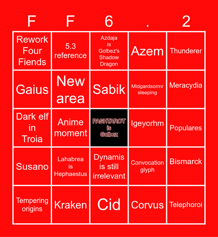 This bingo card has a free space and 24 words: Lahabrea is Hephaestus, Kraken, Sabik, Tempering origins, Thunderer, Rework Four Fiends, Gaius, 5.3 reference, Igeyorhm, Dynamis is still irrelevant, Midgardsormr sleeping, Dark elf in Troia, Convocation glyph, Bismarck, New area, Corvus, Populares, Azdaja is Golbez's Shadow Dragon, Meracydia, Anime moment, Telephoroi, Susano, Azem and Cid.