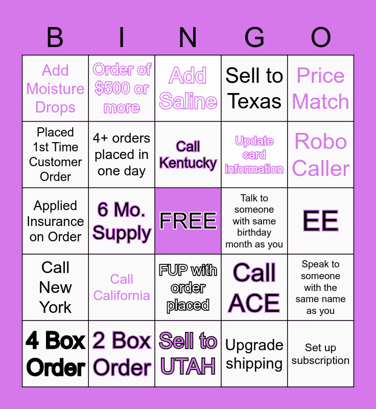 This bingo card has a free space and 29 words: 4 Box Order, FUP, 6 Mo. Supply, Year Order, Add Moisture Drops, Add Saline, 4+ orders placed in one day, Call California, Talk to someone with same birthday month as you, 2 Box Order, EE, Set up subscription, Sell to UTAH, Upgrade shipping, Robo Caller, Call Georgia, FUP with order placed, Call New York, Price Match, Applied Insurance on Order, Call ACE, Order of $250 or more, Update card information, Placed 1st Time Customer Order, Sell to Texas, Order of $500 or more, Speak to someone with the same name as you, Call Kentucky and Order over $750.