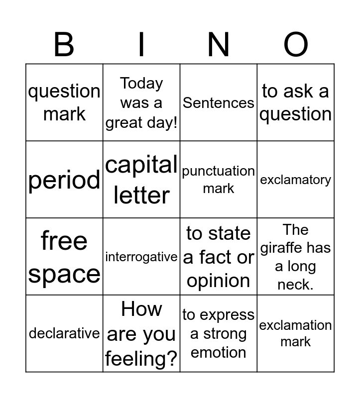 This bingo card has a free space and 15 words: declarative, exclamation mark, Sentences, question mark, exclamatory, period, interrogative, to express a strong emotion, capital letter, free space, The giraffe has a long neck., to ask a question, punctuation mark, Today was a great day! and How are you feeling?.