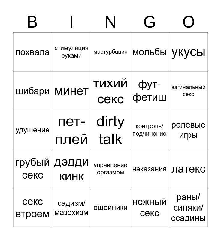 This bingo card has a free space and 34 words: BDSM, нежный секс, анальный секс, секс с инрушками, грубый секс, минет, укусы, секс втроем, стимуляция руками, громкий секс, тихий секс, мастурбация, связывание, куннилингус, контроль/подчинение, вагинальный секс, садизм/мазохизм, удушение, дэдди кинк, наказания, управление оргазмом, кляпы/затыкание рта, похвала, ролевые игры, ошейники, раны/синяки/ссадины, мольбы, наручники, фут-фетиш, шибари, унижение, пет-плей, латекс and клетки.