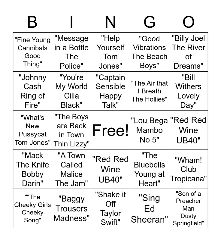 This bingo card has a free space and 24 words: "A Town Called Malice The Jam", "Baggy Trousers Madness", "Captain Sensible Happy Talk", ""The Cheeky Girls Cheeky Song", "Billy Joel The River of Dreams", "Fine Young Cannibals Good Thing", "Johnny Cash Ring of Fire", "Message in a Bottle The Police", "Lou Bega Mambo No 5", "Red Red Wine UB40", "The Air that I Breath The Hollies", "What's New Pussycat Tom Jones", "The Bluebells Young at Heart", "Wham! Club Tropicana", "You're My World Cilla Black", "Sing Ed Sheeran", "Red Red Wine UB40", "Help Yourself Tom Jones", "Bill Withers Lovely Day", "The Boys are Back in Town Thin Lizzy", "Son of a Preacher Man Dusty Springfield", "Mack The Knife Bobby Darin", "Good Vibrations The Beach Boys" and "Shake it Off Taylor Swift".