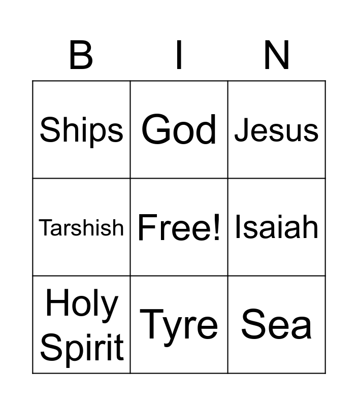 This bingo card has a free space and 8 words: Isaiah, Jesus, God, Holy Spirit, Ships, Sea, Tarshish and Tyre.