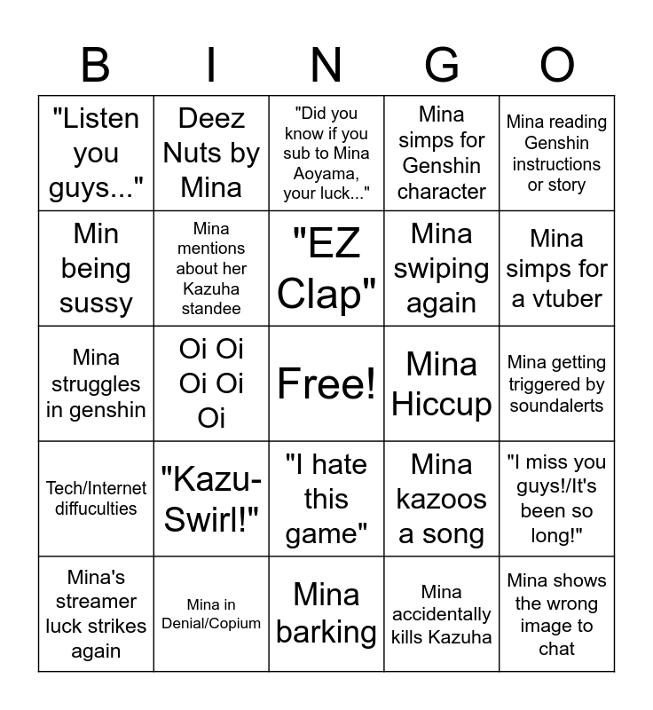 This bingo card has a free space and 24 words: "Kazu-Swirl!", Mina in Denial/Copium, "EZ Clap", Mina's streamer luck strikes again, Mina reading Genshin instructions or story, "Listen you guys...", Min being sussy, Deez Nuts by Mina, Mina Hiccup, "I hate this game", Mina swiping again, Mina struggles in genshin, Mina kazoos a song, "I miss you guys!/It's been so long!", Mina mentions about her Kazuha standee, Mina accidentally kills Kazuha, Mina getting triggered by soundalerts, "Did you know if you sub to Mina Aoyama, your luck...", Mina simps for a vtuber, Oi Oi Oi Oi Oi, Mina shows the wrong image to chat, Tech/Internet diffuculties, Mina simps for Genshin character and Mina barking.